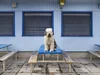LIFE IS LOVEDas Bild zeigt den Hund Ferdinand, einen Bobtail (Old English Sheepdog), an der Plage in Salavaux.Ferdinand sitzt zentral und ruhig auf einem blauen Tisch, fast wie bei einem Porträt. Sein langes, zotteliges Fell in Weiss und Grau fällt ihm über die Augen – typisch für die Rasse – und verleiht ihm einen entspannten, freundlichen Ausdruck.Die Umgebung passt gut zur Plage in Salavaux: einfache Holzbänke, ein gepflasterter Boden mit nassen Stellen und Blättern sowie die hellblaue Fassade im Hintergrund. Die geschlossenen Fenster und die gelbe „Cardinal“-Lampe deuten auf ein Strandkiosk oder eine Badi hin.Durch die klare, symmetrische Komposition und Ferdinands Position in der Mitte wirkt das Bild ruhig, fast inszeniert – mit einem charmanten, leicht humorvollen Charakter, als würde er dort auf Gäste warten.